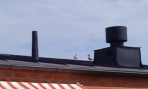 Lösningen blev i alla fall lyckad. Skolavslutningen förlöpte utan problem och veckorna efter travade ungarna omkring på taket med lådan och en dag hade de flyttat ner på marken. Någon vecka efter hittade jag dem på ett intilliggande tak, två flygdugliga unga måsar. Bilden är tagen med en stenåldersmobil, men det går i alla fall att ana dem.